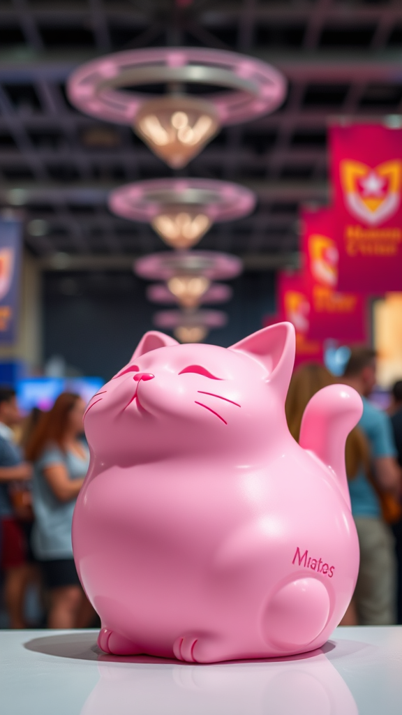 A vibrant image of a pink company merchandise item set against a bustling conference backdrop. In the foreground, a squeezy anti-stress ball shaped like a cat, exudes charm and playfulness, adorned with the company brand subtly engraved on its side. The conference hall buzzes with energy, with blurred outlines of attendees mingling, and colorful banners in the distance adding to the lively ambiance. The cat's glossy surface reflects the overhead lights, highlighting its smooth texture and inviting touch, embodying both fun and functionality.