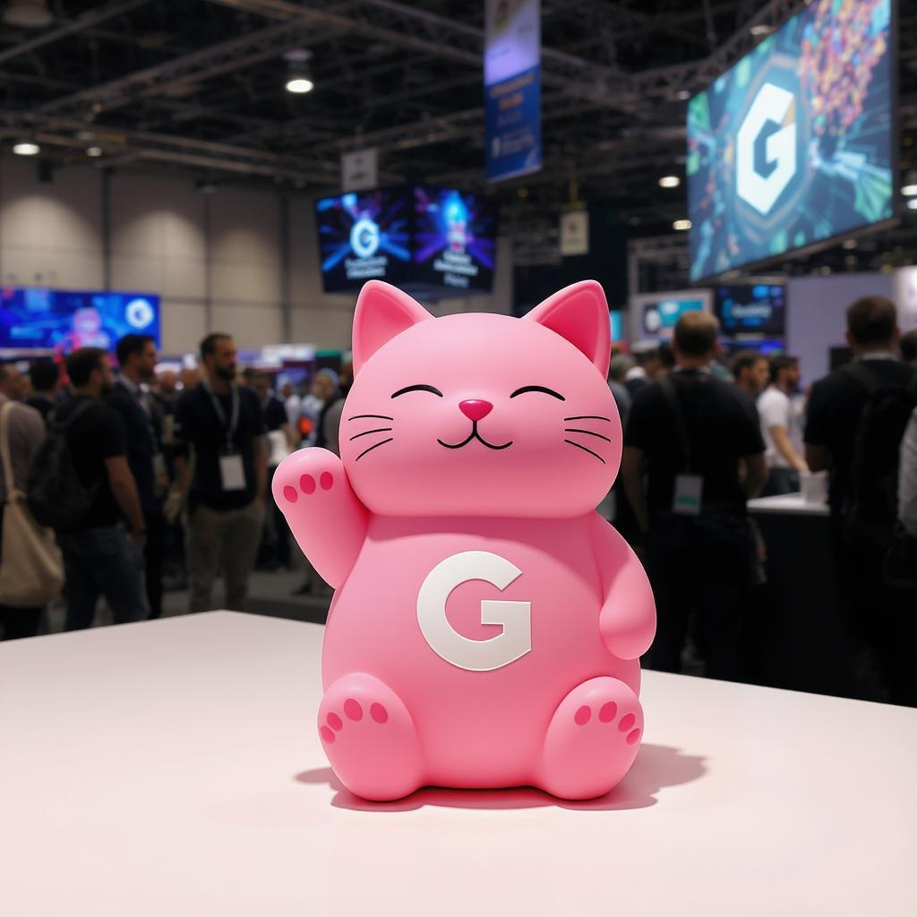 A vibrant image of a pink stress-relief cat toy sitting prominently on a table at a bustling technology conference, surrounded by banners and attendees. The squishy cat, emblazoned with the sleek logo of an innovative tech brand, invites curious onlookers with its quirky charm. In the background, large screens display live demos, while people engage enthusiastically, bringing the atmosphere of creativity and collaboration to life.