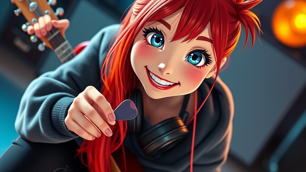 A vibrant image of a single girl with a playful gaze directed at the camera, her smile warm and inviting. Her attire is casual yet stylish, consisting of black pants and a comfortable hoodie. Her striking blue eyes sparkle with intrigue. She wears headphones around her neck, adding a modern touch. In her hand, she holds a plectrum, ready to strum the guitar slung over her shoulder. Her long, flowing, fiery-red hair is styled with one side pinned up, and her red lips accentuate her Asian features. The scene is captured with hyper detail and dramatic lighting that brings out intricate details and high contrast. The perspective is dynamic, focusing on a full-body, cowboy-shot angle that captures her in a slightly blurred, animated style.