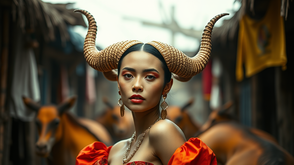 A vibrant image of a woman elegantly posing with intricately crafted horns on her head, drawing inspiration from the inventive style of Brian Jungen and the sophisticated aesthetics of Steven Meisel. The composition features a narrow aspect ratio, highlighting the vertical grace of the subject. The scene is infused with a raw, unstaged quality, accentuating the vivid textures and striking contrast of colors. Her attire and surroundings subtly mimic the cultural blend often seen in Jungen’s work, while the lighting and mood reflect Meisel’s nuanced approach to fashion photography, creating a visually arresting and avant-garde portrait.