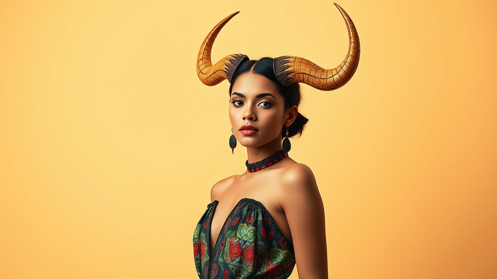 A vibrant image of a woman standing confidently with artistic horns adorning her head, drawing inspiration from the styles of Brian Jungen and Steven Meisel. The composition captures a fusion of avant-garde fashion and indigenous-inspired art, with a focus on intricate detailing and bold color contrasts. The background is minimalist to emphasize the subject, while the overall atmosphere conveys a raw and edgy aesthetic. The image balances organic elements with a contemporary twist, highlighting the woman's graceful yet powerful presence.