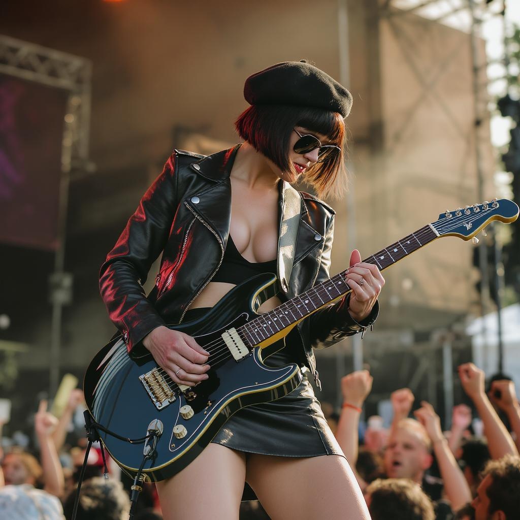 A vibrant image of a woman with a sleek angled bob haircut passionately playing an electric guitar, her fingers expertly moving over the strings as she loses herself in the rhythm. The crowd's energy is palpable, fueling her performance. She sports a stylish black newsboy hat and dark sunglasses that add an air of mystery, complementing her edgy black leather jacket layered over a form-fitting low V-neck crop top, paired with a tight miniskirt that exudes confidence. It's daytime, and she's on stage at an outdoor concert, bending forward in a powerful stance, her silhouette striking against the intense backlight streaming from the stage lights, capturing a moment of musical transcendence.
