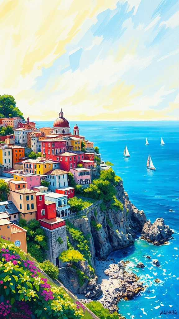 A vibrant impressionist oil painting of the Amalfi coast on a bright and sunny day, showcasing colorful buildings and intricate domes perched above the shimmering sea with sailboats dotting the horizon. The scene is rich with lush greenery cascading down the cliffs, the artist's detailed brushstrokes capturing the lively atmosphere. The textured canvas effect enhances the vivid colors and adds depth, highlighting the impressionistic technique. The composition is in high resolution, offering an elongated perspective that gracefully stretches across the scene.