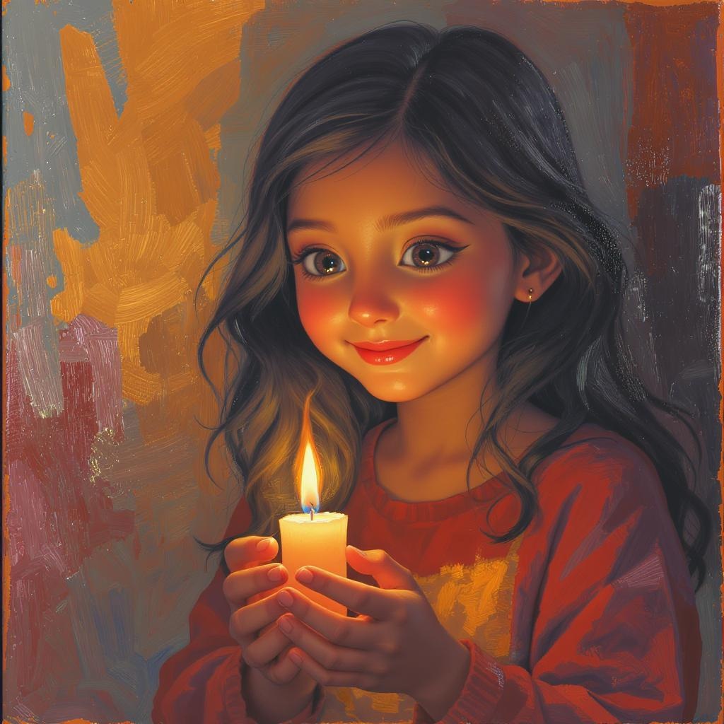 A vibrant, impressionistic painting of an adorable woman with a gentle smile, her large, luminous eyes captivated by the flickering flame of a candle cradled in her hands. The glow from the flame casts a soft, warm light that dances across her features, highlighting the warmth and serenity in her expression as she gazes intently. Her hair cascades around her shoulders, blending into the rich hues of the surrounding abstract background, creating a harmonious and intimate atmosphere. The mood is one of quiet contemplation and blissful tranquility as the candle's light draws her into a peaceful reflection.