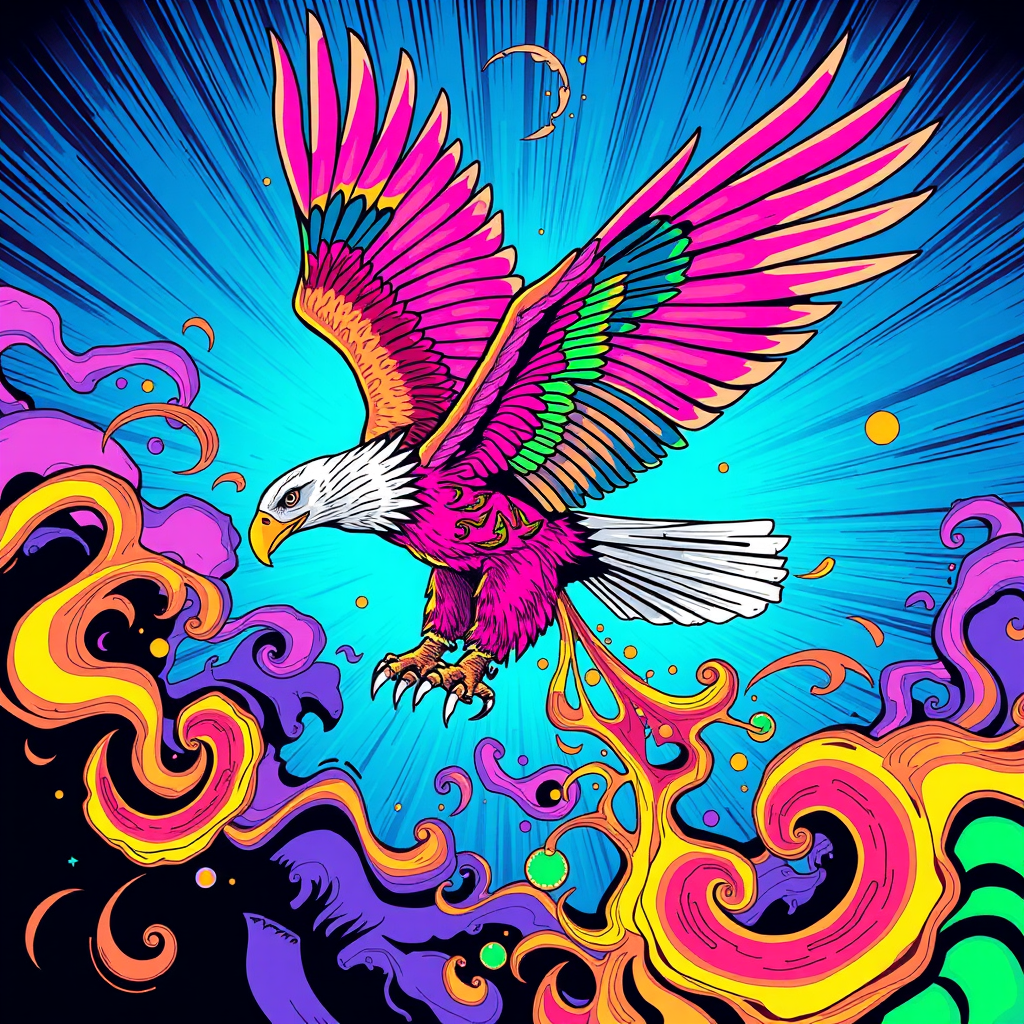 A vibrant, kaleidoscopic eagle soaring through an electric blue sky, its feathers radiating neon pinks, greens, and oranges. The scene explodes with comic-style outlines, capturing the dynamic motion and energy, as abstract swirls and patterns dance around in a harmonious fusion of psychedelic artistry.