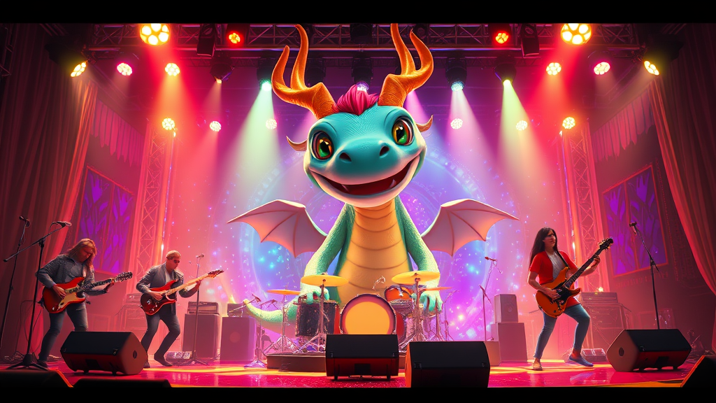 A vibrant key shot of a colossal mythical creature band performing on a dazzling stage, with instruments glowing in harmony. The scene captures the whimsical spirit of Studio Ghibli, Pixar, and Disney, rendered in stunning 3D with Unreal Engine 5's sharp detail. The creature's expressive eyes and playful motion are reminiscent of anime key art by Greg Rutkowski, set against a backdrop of vivid colors and fantastical elements. Bloom effects and dramatic lighting highlight the magical atmosphere, casting soft glows that dance across the stage. The creature's joyous expression and the dynamic energy of the performance exude warmth and wonder, inviting viewers into a world where imagination and music intertwine seamlessly.