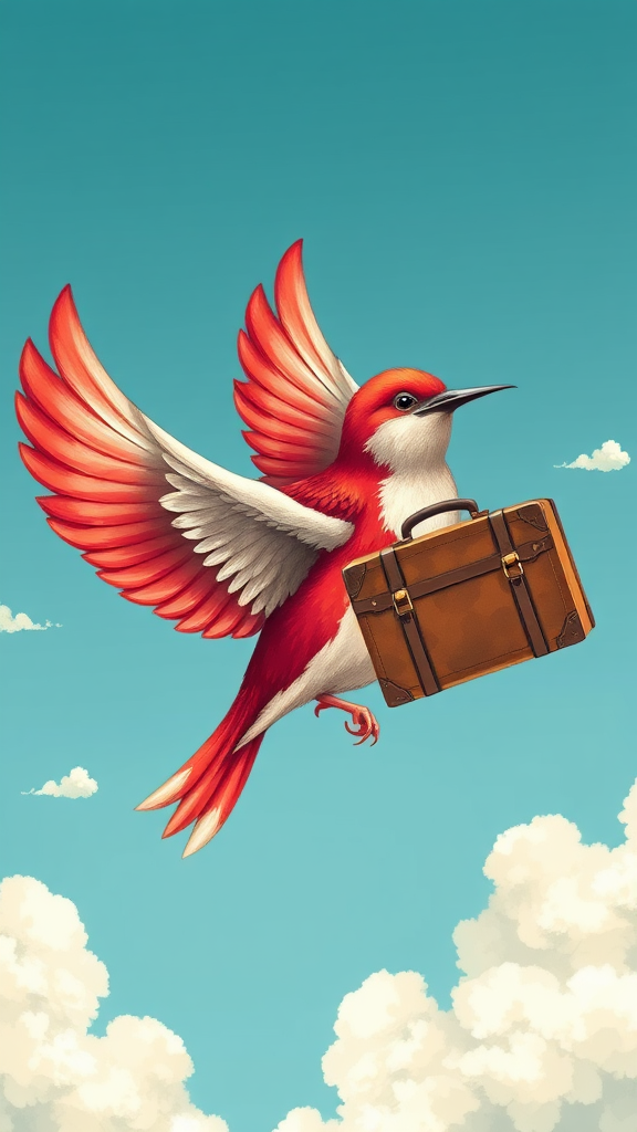A vibrant logo for a travel website featuring a crimson bird with ivory wings gracefully clutching a vintage suitcase, soaring through an azure sky dotted with fluffy white clouds. The design showcases intricate, whimsical artwork reminiscent of Beatrix Potter, infused with cottagecore charm. The imagery is rendered in an ultra-high definition with meticulous detail and presented at a dynamic 45-degree angle, capturing a sense of adventure and nostalgia.