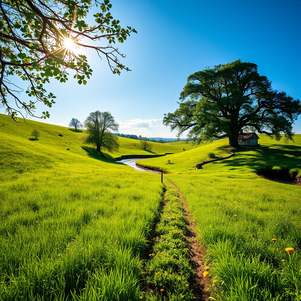 A vibrant, lush green landscape stretches towards the horizon under a clear blue sky, with verdant rolling hills dotted with clusters of clovers swaying gently in the breeze. A narrow path meanders through the grass, leading to a quaint, charming cottage nestled amongst ancient oak trees. The sunlight filters through the leaves, casting intricate patterns and illuminating the golden wildflowers scattered throughout the meadow. In the distance, a gentle stream reflects the azure sky, adding an enchanting touch to this serene and picturesque scene.