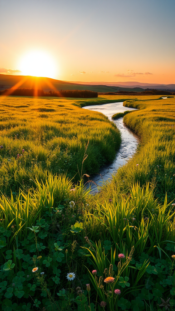 A vibrant meadow under the golden glow of the setting sun, dotted with lush clovers and wildflowers, with a serene river winding through the landscape. A gentle breeze ripples through the grass, creating waves of green and gold. The horizon is lined with distant hills, and a few fluffy clouds drift lazily across the sky. The scene is tranquil, imbued with the warmth of a perfect spring evening, capturing the essence of nature's serene beauty.