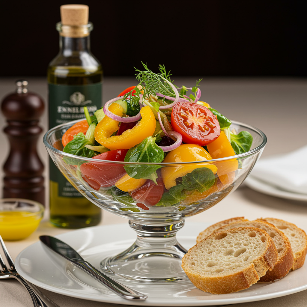 A vibrant medley of fresh vegetable salad in an elegant crystal glass bowl, drizzled with premium olive oil and accompanied by artisanal bread, presented in a lavish Michelin-quality kitchen setting. Captured with studio lighting, highlighting intricate details and textures, the scene is enhanced by a shallow depth of field and soft uplighting, emphasizing the natural beauty and rich colors of the ingredients in a close-up view.
