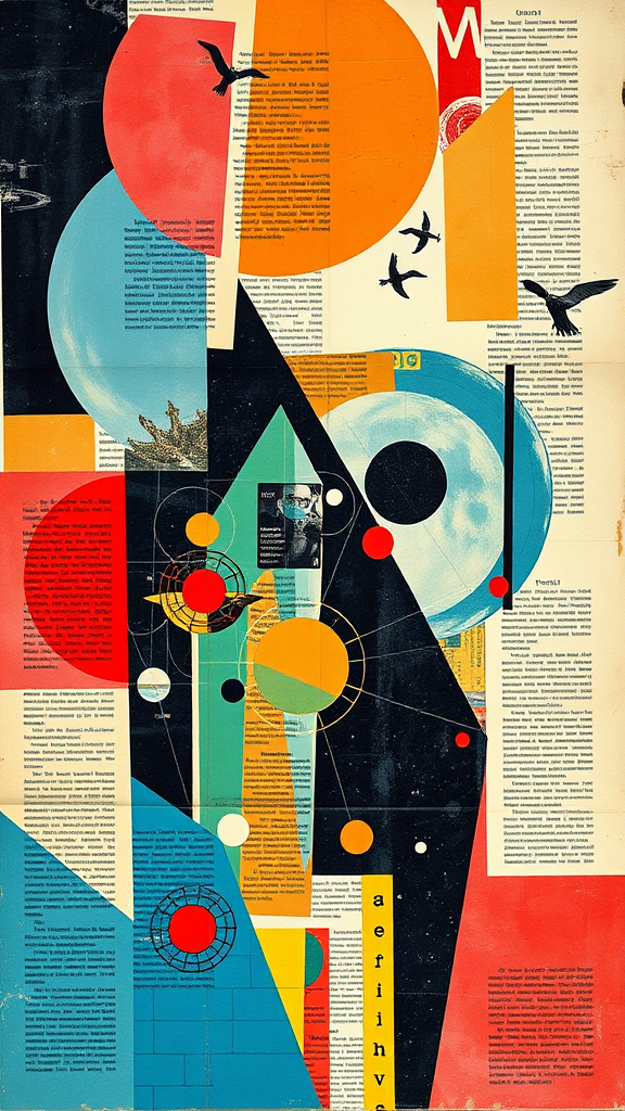 A vibrant mid-century modern collage depicting the essence of 2001: A Space Odyssey; composed of abstract shapes from vintage fashion and science magazines, blending with snippets of text from academic textbooks. The collage intertwines vivid colors and textures, capturing the film's thematic elements of exploration and evolution, while maintaining an artistic fusion of retro aesthetics and futuristic motifs. The composition embodies a harmonious balance between iconic imagery and avant-garde abstraction, evoking the timeless vision of the classic film poster.