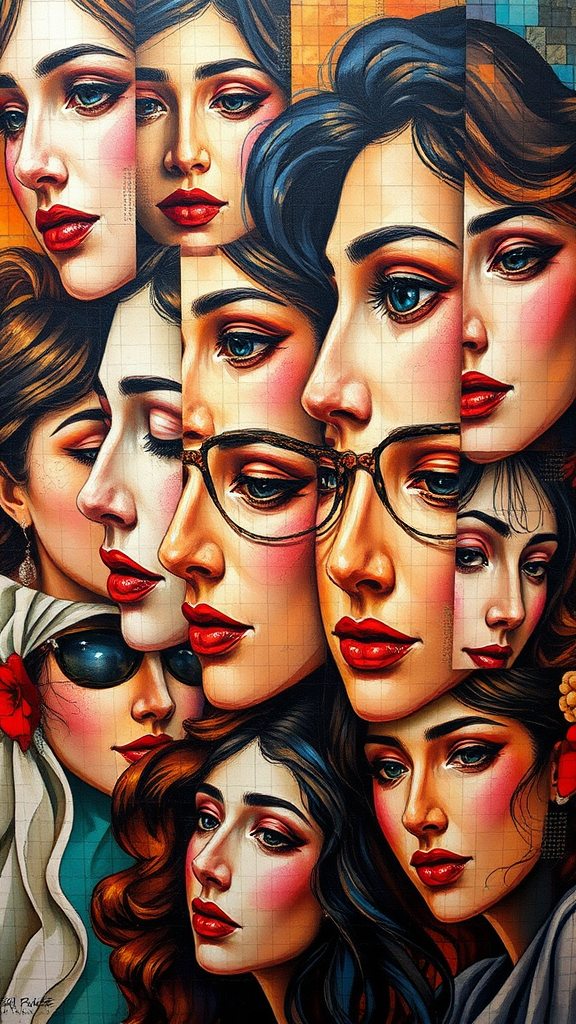 A vibrant mosaic collage of women's faces, capturing an array of emotions and expressions, blending rich and dynamic colors with delicate brushwork. The composition reflects the elegance and fluidity of Andrew Atroshenko's style, combining with Peter Gric's intricate structures and surreal details. The artwork seamlessly merges classical beauty with contemporary abstraction, creating a harmonious tapestry of feminine essence and diverse individuality, set against a backdrop that suggests depth and movement.