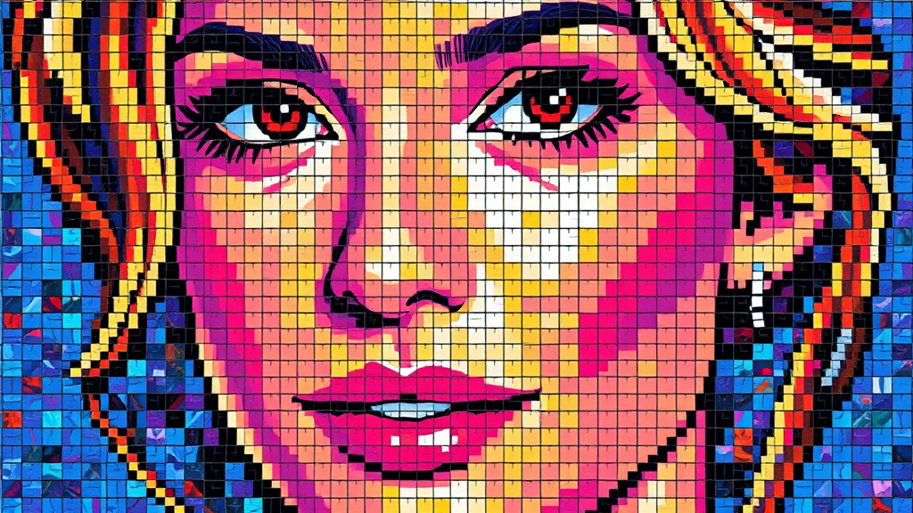 A vibrant mosaic depicting a celebrity's visage, each small square shimmering with a unique hue, merging to form a colorful portrait.