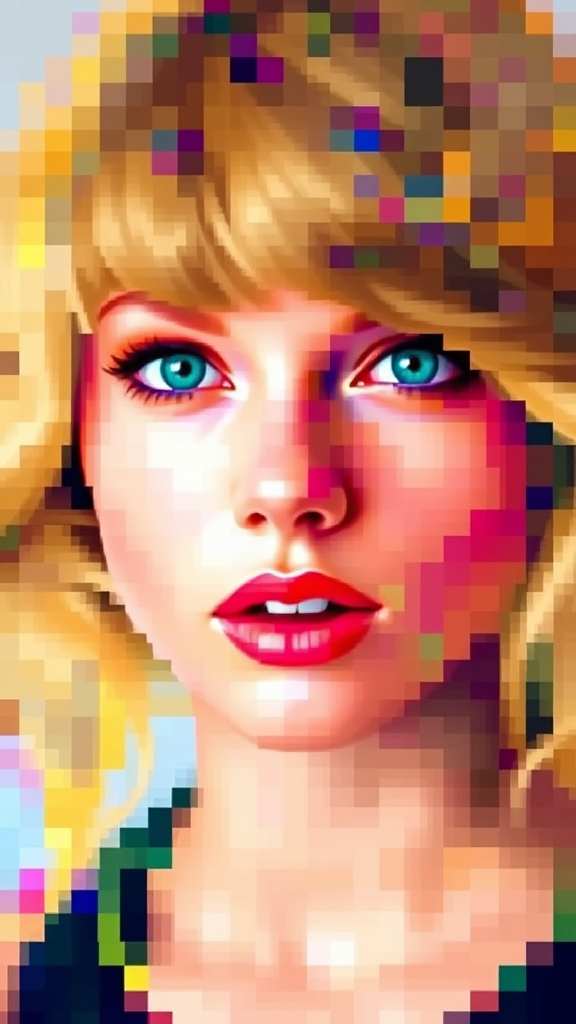 A vibrant mosaic of blurred colors forms an abstract, pixel-like portrayal of Taylor Swift's iconic visage, blending hues seamlessly as if painted with a digital brush.