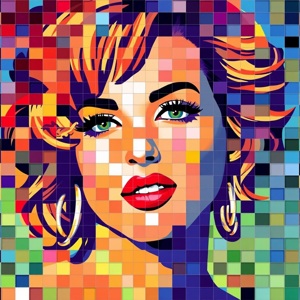 A vibrant mosaic of colored squares forming a recognizable image of a pop star's face, blending shades creatively to capture her iconic features.