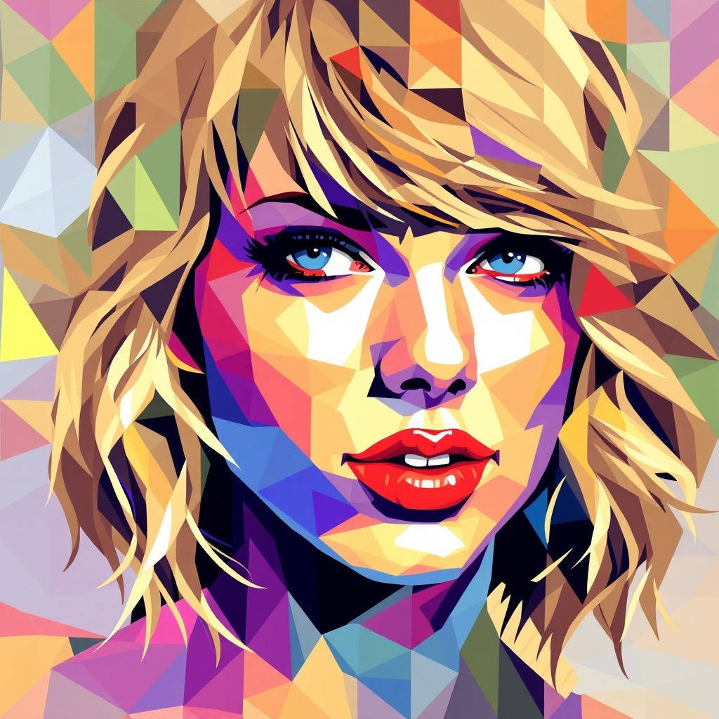 A vibrant mosaic of Taylor Swift's face composed of an array of colorful geometric shapes, each piece blending seamlessly into the next, creating a pixelated and artistic representation.