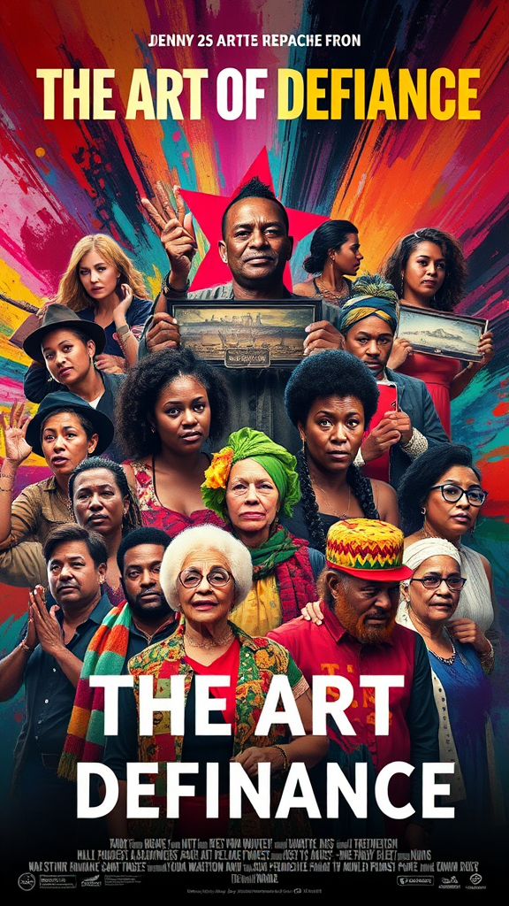 A vibrant movie poster for "The Art of Defiance" showcases a diverse array of artists and cultural icons, each presenting a distinctive piece that represents their unique movements and battles. The background bursts with a dynamic and vivid color palette, blending abstract and realistic art styles. The overall tone of the poster is uplifting and empowering, highlighting the transformative power of art and creativity in challenging times.