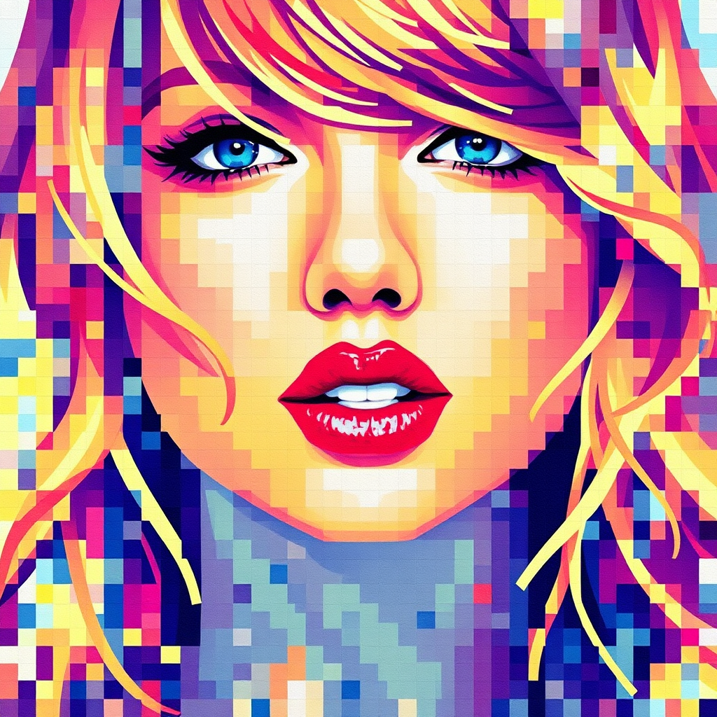 A vibrant, multicolored mosaic capturing Taylor Swift's expression, her features artfully transformed into a grid of colorful pixels, blending harmoniously into a modern digital artwork.