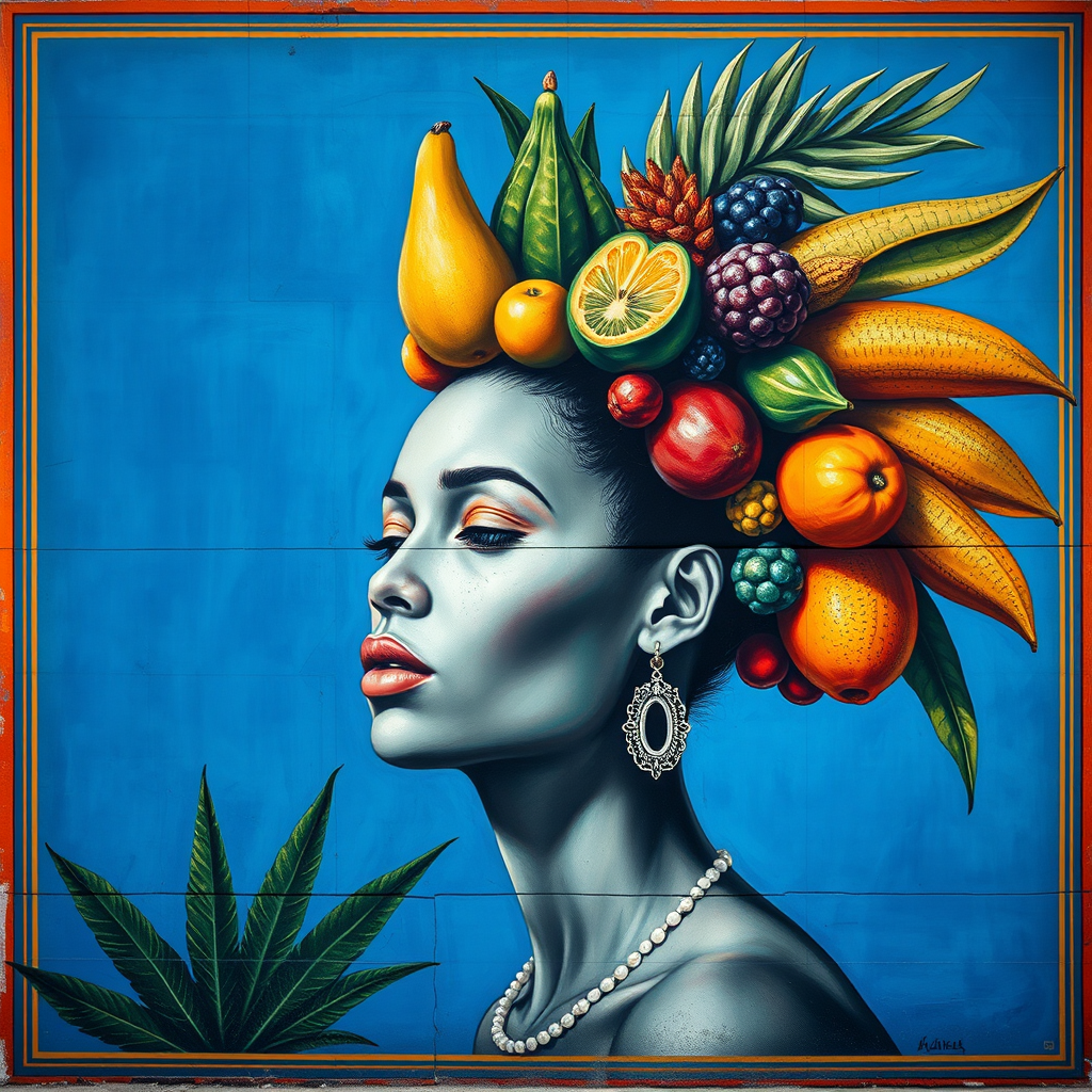 A vibrant mural depicting a woman with alabaster skin, adorned with an array of tropical fruit atop her head, set against a rich azure background; the artistic vision inspired by Ingrid Baars merges with elements of Benin art. The scene is bathed in the harmonious cultural influences of melting pots and rendered with the opulent detail reminiscent of Paolo Veronese. The composition evokes the dramatic contrasts of chiaroscuro portraitures, capturing an aura of timeless elegance in a 32k UHD resolution. The portrait subtly echoes the raw yet ethereal beauty, blending traditional and contemporary aesthetics seamlessly.