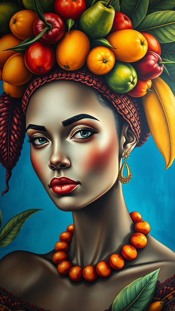 A vibrant mural features a porcelain-skinned woman adorned with an elaborate headdress of tropical fruits, set against a rich azure backdrop. Her serene expression, highlighted by the interplay of light and shadow, evokes the chiaroscuro techniques reminiscent of Paolo Veronese. The artwork blends the intricate textures and cultural motifs of Benin art with elements of modern digital artistry, creating a melting pot of styles. Fine details capture the luminous quality of Ingrid Baars' portraits, rendered in stunning 32k UHD resolution. The mural commissions a narrative of cross-cultural beauty, with fluid, organic forms subtly intermingling to suggest a sense of movement and transformation within this portrait of elegance and cultural fusion.
