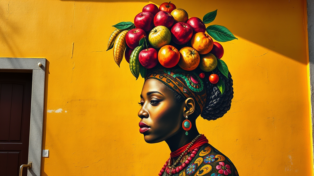 A vibrant mural featuring a regal woman with a cascade of colorful fruits elegantly balanced on her head graces a warm, golden wall. This artwork draws from the rich textures and cultural depth of Benin art, infused with the contemporary flair akin to the style of Ingrid Baars. The mural's composition, with its intricate play of shadows and light, pays homage to the chiaroscuro techniques reminiscent of Paolo Veronese’s masterpieces. This commissioned piece, a true melting pot of artistic styles, invites viewers to explore the harmony between traditional and modern aesthetics, every detail captured in breathtaking 32k UHD quality.