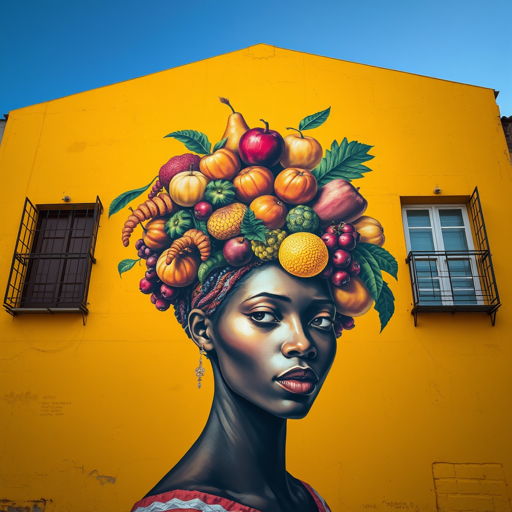 A vibrant mural of a woman graces a golden yellow wall, her head adorned with an eclectic assortment of fruits, reminiscent of Ingrid Baars' intricate style. The scene is a fusion of Benin art and melting pot influences, with a nod to Paolo Veronese's opulent compositions. The woman's visage emerges from the chiaroscuro, beautifully rendered in a 32k UHD clarity, capturing every detail of texture and form. The mural stands as a contemporary homage to traditional artistry, commissioned to blend the richness of cultural identity with modern aesthetic sensibilities, creating a striking 3:4 aspect ratio portraiture.