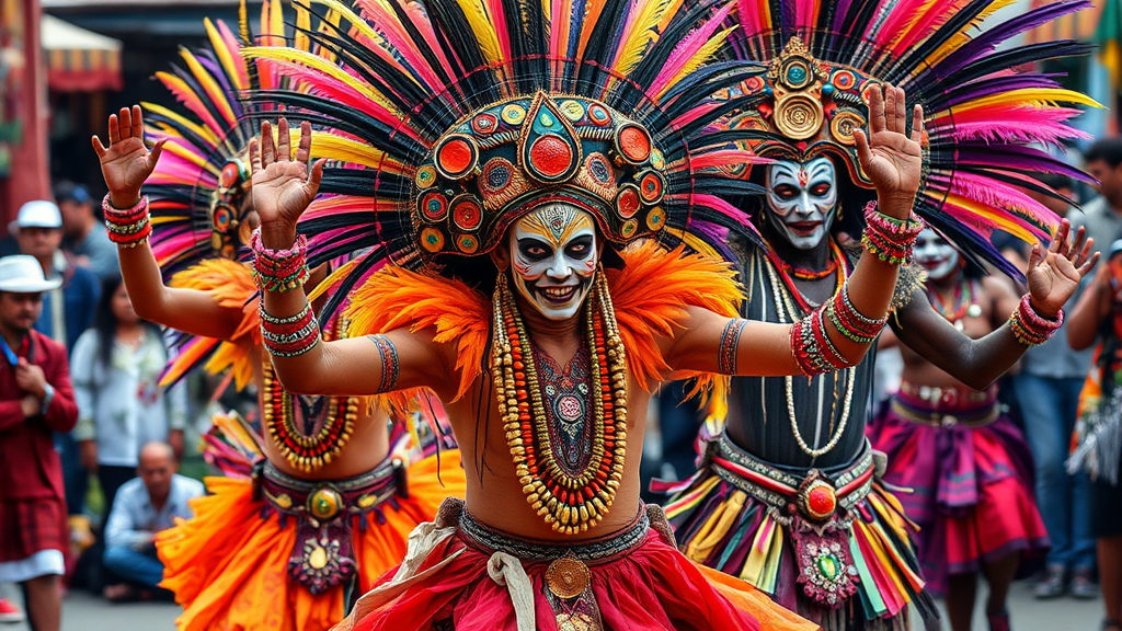 A vibrant, mystical festival where performers don elaborate, colorful costumes and intricate face paint, embodying deities and ancestral spirits through rhythmic dance and mesmerizing rituals, captivating onlookers with their dynamic expressions and transcendent energy.