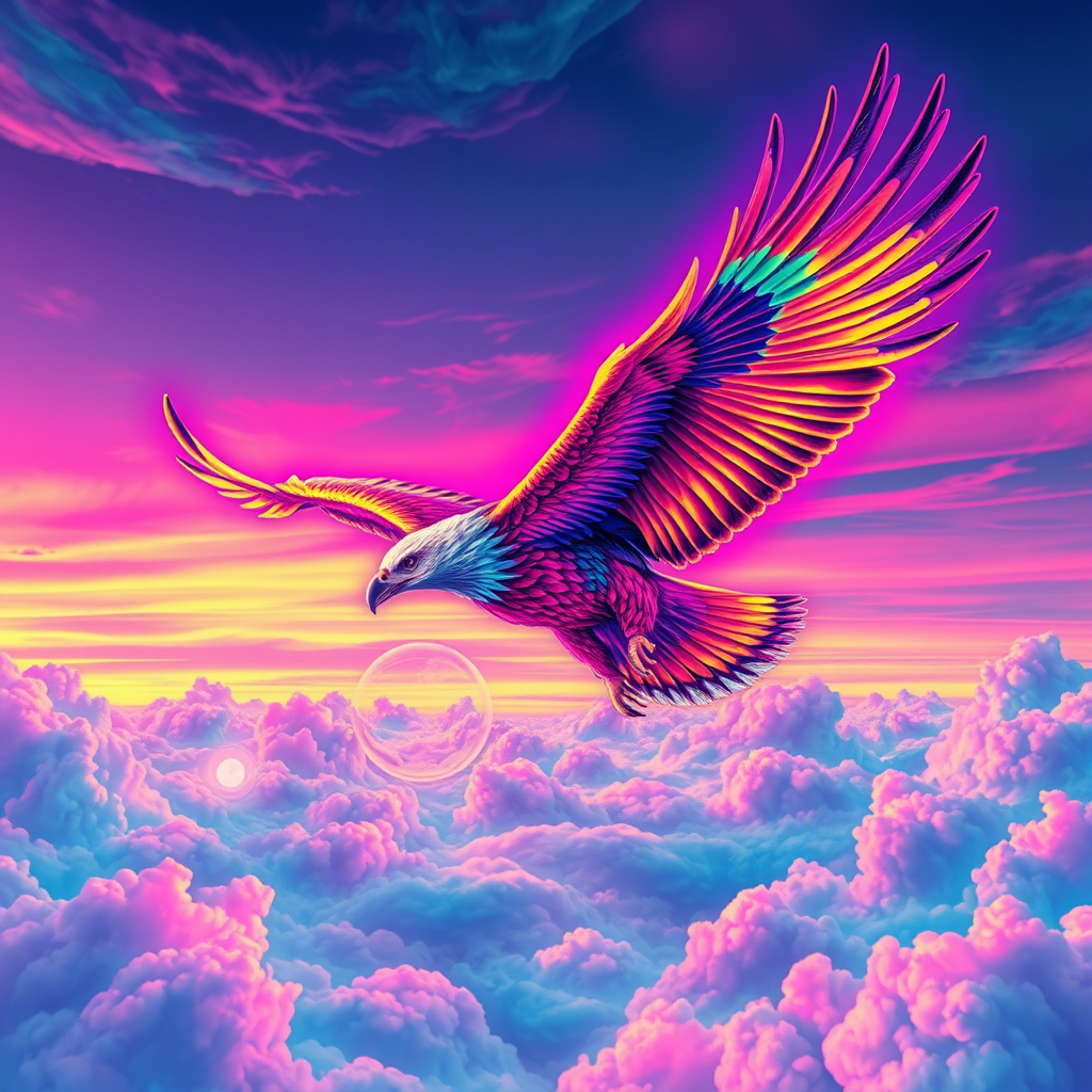 A vibrant, neon-hued eagle soaring through a surreal sky, its feathers swirling with electric colors, as if leaping from the pages of a comic book adventure, each stroke of its wings leaving behind trails of psychedelic patterns that dance across the horizon.