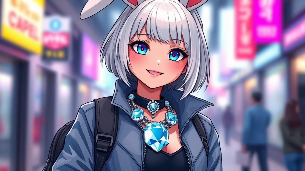 A vibrant nijigirl with bunny ears is donned in a sleek techwear jacket and fitted jeans, her hair styled in a striking milky bob cut. She has a radiant, big warm smile that lights up her face. Around her neck hangs a huge, dazzling diamond necklace that glints in the light. Her strikingly large, beautiful cobalt ODD eyes add an extra layer of allure. She carries a stylish backpack, and her poised stance accentuates her large bust. Her presence exudes a blend of playfulness and futuristic style, with intricate details that capture the imagination.