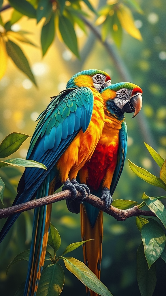 A vibrant oil painting depicting a pair of parrots perched on a lush, leafy branch. The artwork is inspired by the style of Marcin Sobas, showcasing intricate details and a dynamic interplay of intense light and shadow. The scene captures the vivid colors of the parrots' plumage against the soft focus background, evoking a sense of tropical warmth and vitality. The use of rich textures and a Ferrania P30 influence adds depth and character to the composition, highlighting both the beauty of nature and the subtle interactions of the birds, creating a harmonious balance between animals and their surroundings.