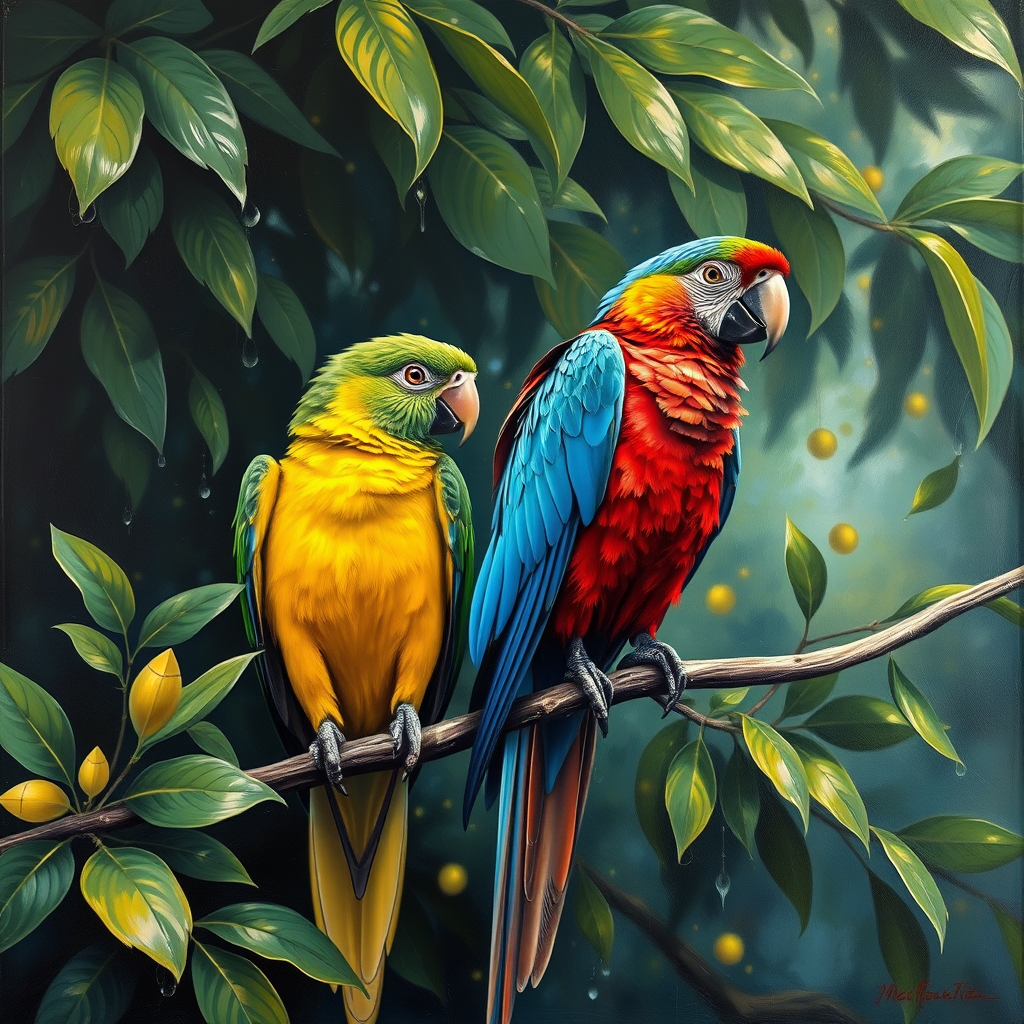 A vibrant oil painting featuring two exotic parrots perched gracefully on a lush branch, in the distinctive style reminiscent of Marcin Sobas, captured in ultra-high definition. The scene is brought to life with a masterful play of intense light and shadow, evoking the rich contrast of Ferrania P30. The composition weaves in subtle hints of human presence, intertwining the world of animals and people in a harmonious dance. The artwork is infused with an elevated sense of style and creativity, resulting in a captivating visual narrative full of depth and vibrancy.