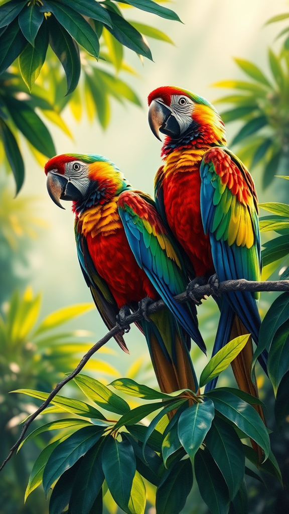 A vibrant oil painting of two parrots perched on a lush, leafy branch, depicted in the style of Marcin Sobas. The artwork features intense play of light and shadow, capturing the vivid colors and intricate details of the parrots' feathers. The background subtly hints at a bustling rainforest, with rays of sunshine filtering through the verdant canopy. The scene is reminiscent of a classic Ferrania P30 photograph, offering a dynamic blend of realism and artistic expression. The composition feels alive with an engaging interplay between the vivid colors of the birds and the serene, natural surroundings.