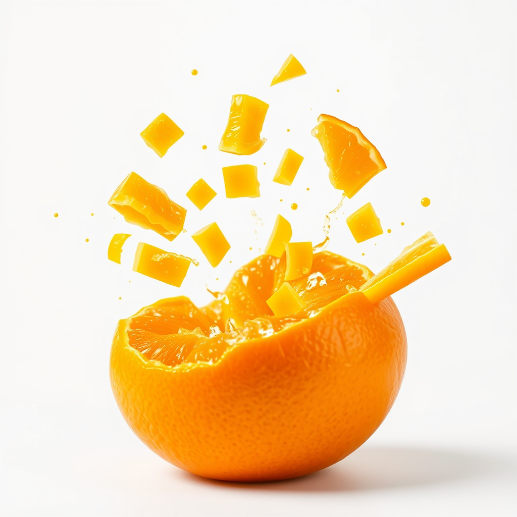 A vibrant orange fruit, artistically dissected, with its sections and juicy segments energetically bursting outward in a dynamic explosion, set against a minimalist white backdrop. The fragments arc gracefully, revealing the intricate textures and brilliant hues of the orange's flesh, while small playful elements of citrus zest and pith add an unexpected whimsical touch to the composition.