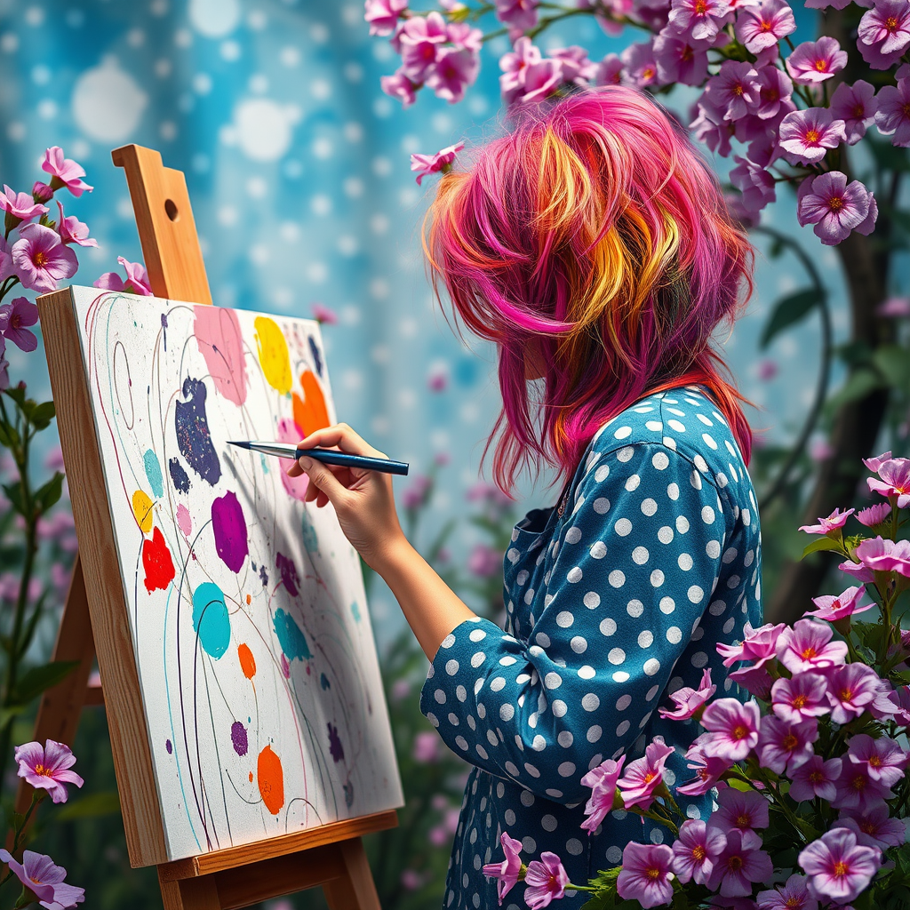 A vibrant painter immersed in the creation of an abstract masterpiece, their colorful hair reminiscent of a living canvas, set against a whimsical world inspired by Kazuo Oga. The scene is alive with polka dot patterns and blooming flowers in shades of purple and pink, blending seamlessly into the painter's surroundings. Capturing the essence of artistic influence, the composition is captured in ultra-high-definition, with every detail in sharp focus, revealing a magical atmosphere where creativity and nature harmonize effortlessly.