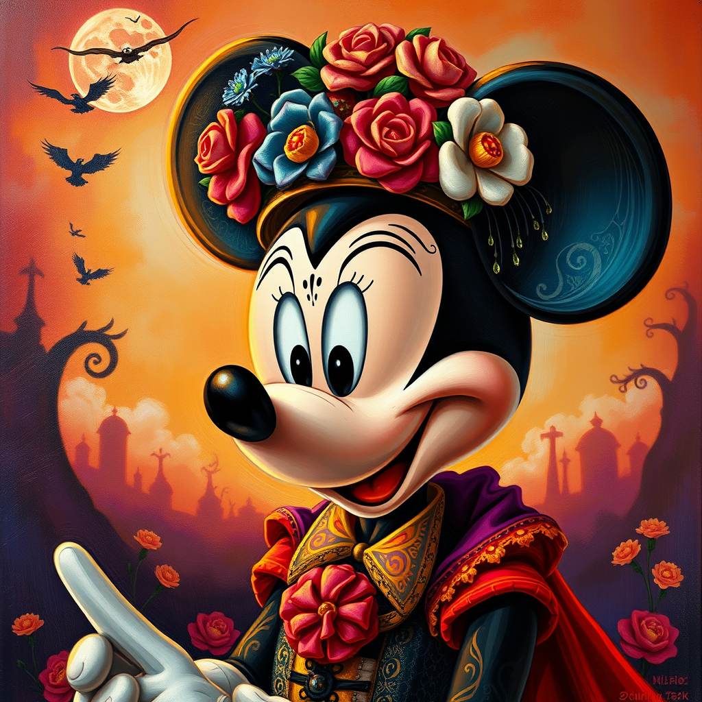 A vibrant painting depicts Mickey Mouse adorned with the intricate make-up of a Catrina, capturing the essence of Disney animation in stunning 32k UHD. The character caricature showcases a whimsical yet mysterious backdrop, with lively tableaus enhancing the scene. The composition features bold colors and expressive details, with delicate floral patterns and elegant skull motifs subtly incorporated into Mickey's iconic features. The mysterious background adds depth with shadowy silhouettes of fantastical landscapes, blending traditional Mexican artistry with Disney's enchanting world.