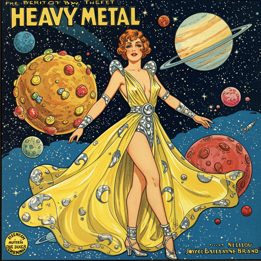 A vibrant painting featuring a woman in a flowing yellow dress, reminiscent of heavy metal comic cover art with a cosmic twist. The scene is set in space, with planets artistically imagined as colorful candy, adding a whimsical touch. The woman poses as a classic pin-up girl, exuding confidence, her attire seamlessly blending lunar motifs and a silver and yellow color scheme. Inspired by the style of Joyce Ballantyne Brand, the artwork embodies the charm of a golden age illustrator, with a nod to vintage aesthetics. The background is a harmonious blend of blue and black hues, serving as a striking backdrop to the celestial theme. Text and typography elements are intricately incorporated, enhancing the overall composition while staying true to the illustrative style.