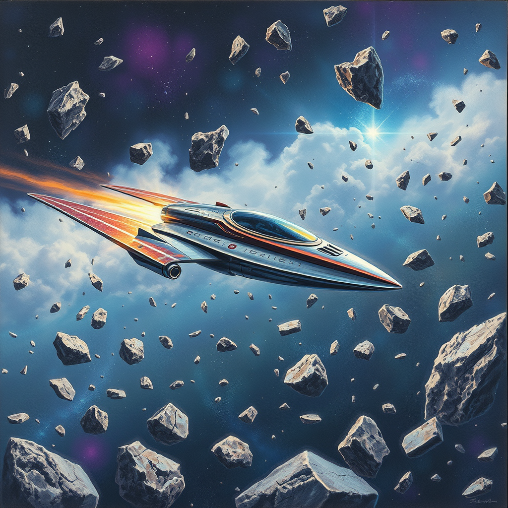 A vibrant painting of an alien spacecraft gracefully navigating through a dense asteroid field, its sleek design glinting against the backdrop of cold, empty space. Meteorites of various sizes hurtle past, while distant stars twinkle through wispy gas clouds, casting subtle hues of violet and blue. The small spaceship maneuvers skillfully, its agility highlighted in the intricate details of its alien craftsmanship, set amidst the grandeur of the cosmos, reminiscent of the ethereal style of BelleDeesse.