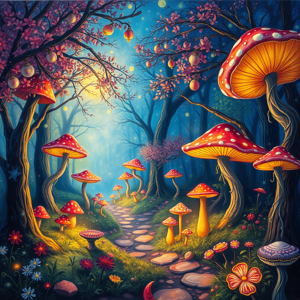 A vibrant painting of an enchanted woodland, suffused with ethereal light, teeming with a kaleidoscope of colors, whimsical mushroom-shaped trees, and a softly glowing ambiance, intricately detailed, reminiscent of the hyper-realistic style of Unreal Engine 5, rendered in HDR at 12k resolution, capturing the imaginative essence of Vincent Van Gogh with a surreal, dreamlike twist.