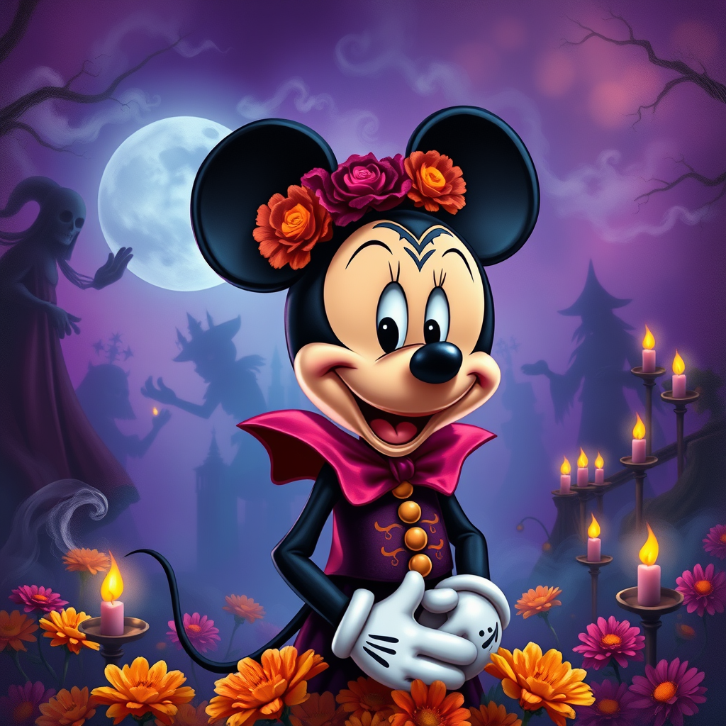 A vibrant painting of Mickey Mouse adorned with intricate Catrina makeup, styled in classic Disney animation with character caricatures, set against a mysterious backdrop filled with swirling mists and shadowy figures. The scene is a lively tableau with elements of traditional Dia de los Muertos celebrations, featuring colorful marigolds and flickering candles. The background is a dreamlike blend of deep purples and blues, creating an atmosphere both enchanting and whimsical. Mickey's expression is playful yet reverent, capturing the spirit of celebration and remembrance. Ultra-high-definition details bring the scene to life with a stunning 32k resolution, maintaining the magic and charm of Disney's timeless style.