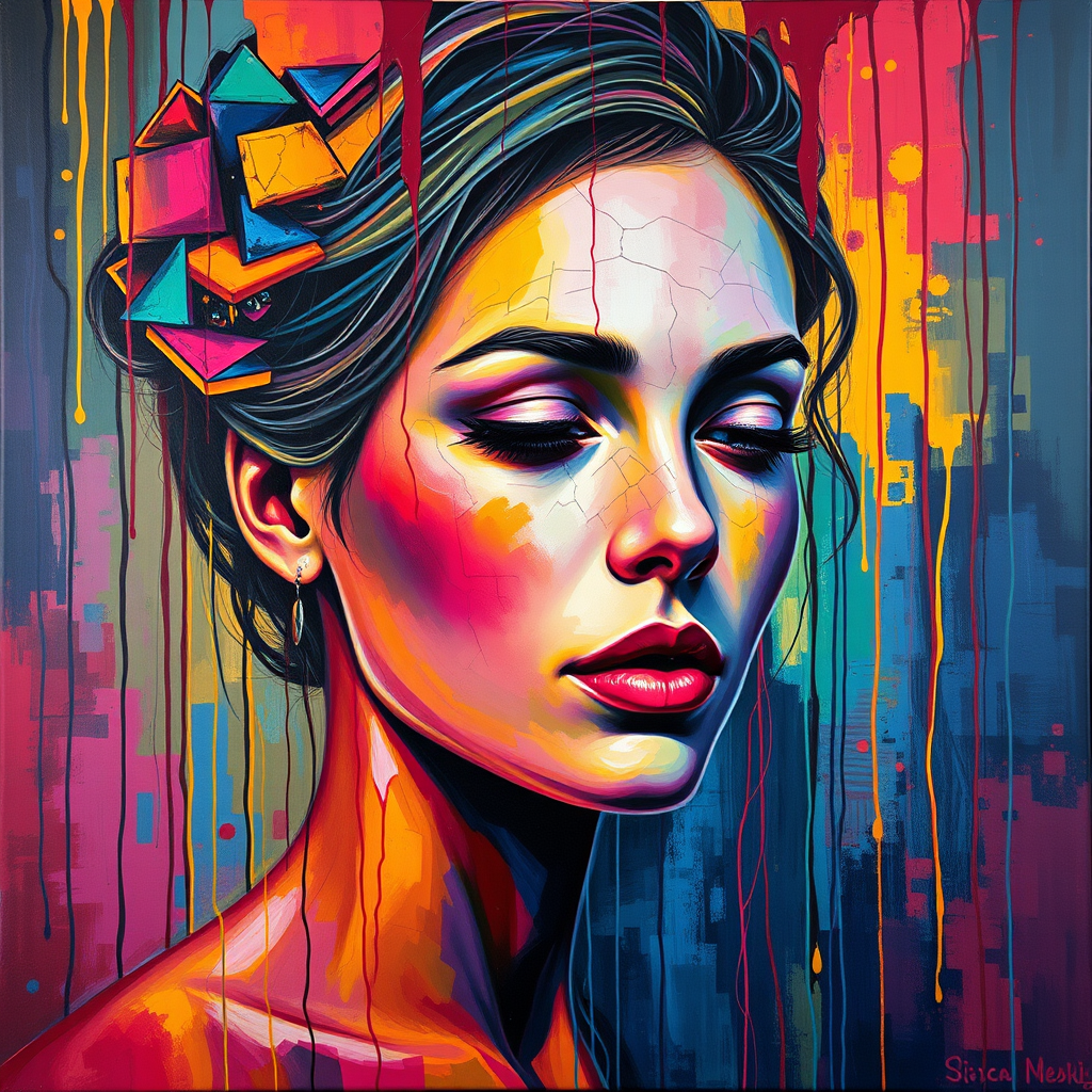 A vibrant painting on canvas featuring a woman in a spectrum of colorful hues, reflecting the style of Martin Ansin. Her serene face, reminiscent of cracked porcelain, melds with the artistry of Dimitry Roulland, as paint drips in a mesmerizing technique. The scene is illuminated by gorgeous, rich colors that interweave with geometric patterns, creating a captivating composition. Aspect ratio 117:146, with a slight variation in texture and tone for added depth.