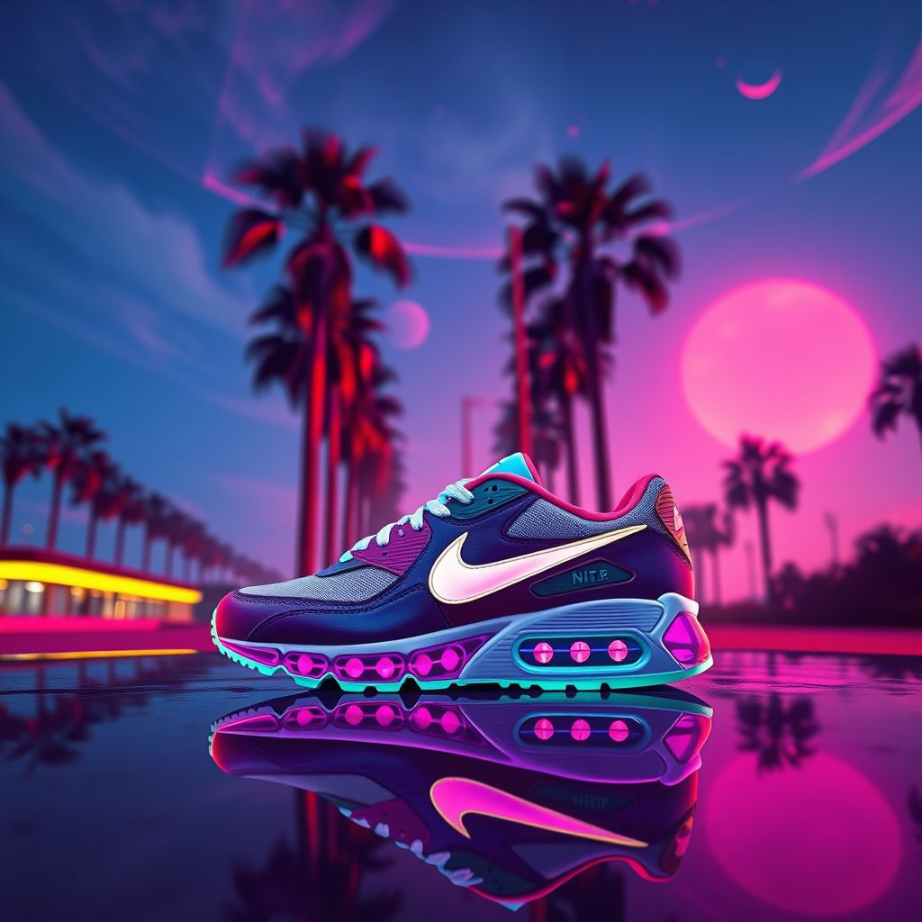A vibrant pair of Nike Air Max sneakers resting on a glossy surface with towering palm trees silhouetted against a neon-lit sky, infused with Dmitry Levitzky's signature style. The backdrop embraces a fusion of art deco and outrun anime aesthetics, reminiscent of the colorful and futuristic vibe found in the Grimes - Book 1 album cover. This concept art piece exudes the edgy and contemporary flair characteristic of Juxtapoz magazine, blending striking colors with a dynamic urban landscape.