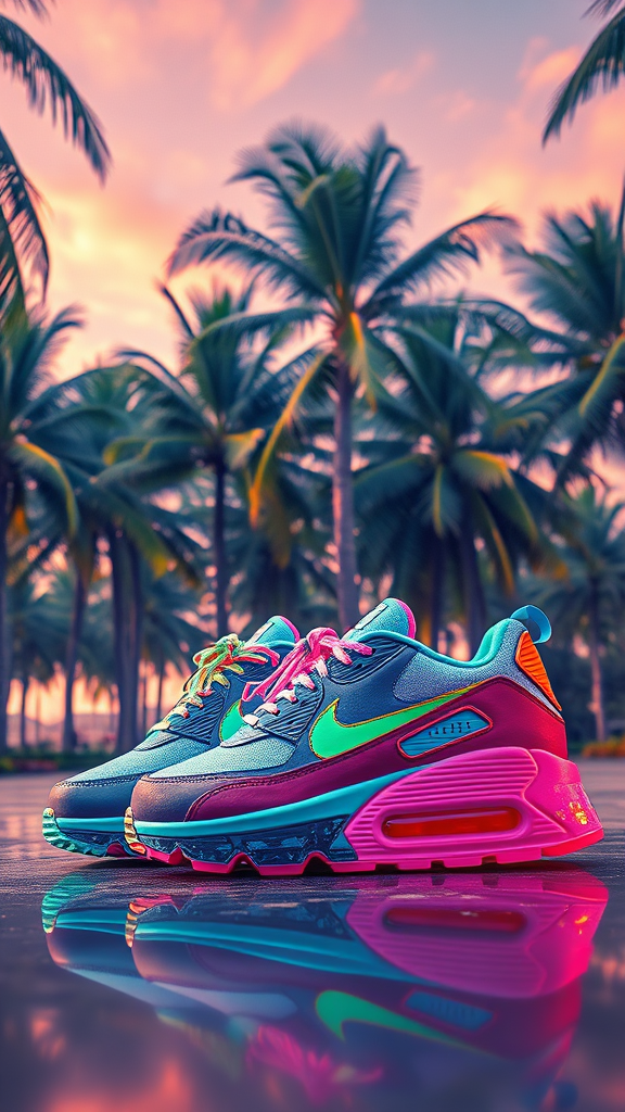 A vibrant pair of Nike Air Max sneakers set against a backdrop of tropical palm trees, infused with the ethereal vibe of Dmitry Levitzky’s style, reminiscent of the surreal world captured on the Grimes - Book 1 album cover. The scene embraces a fusion of Art Deco and outrun anime aesthetics, reflecting the bold colors and dynamic lines akin to the pages of Juxtapoz magazine.