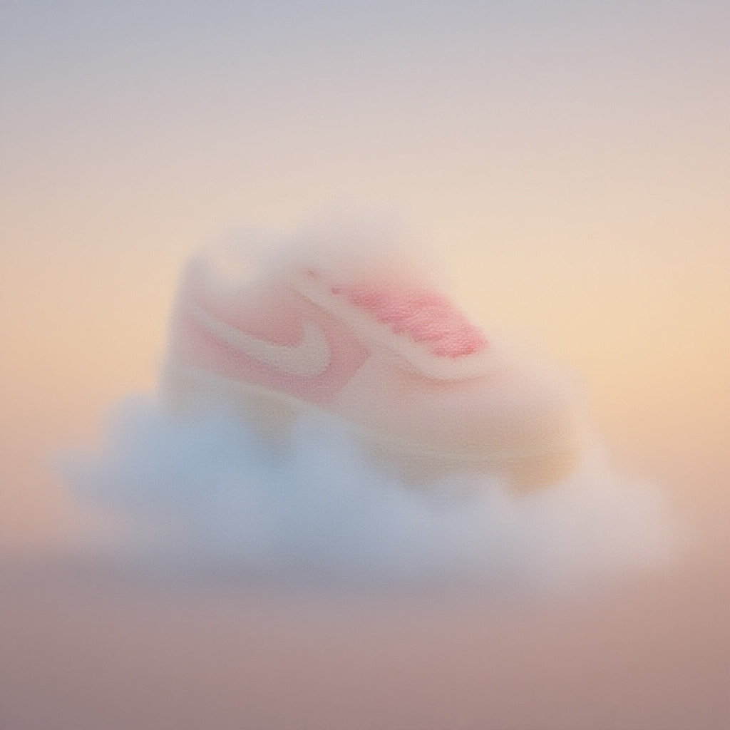 A vibrant pair of shoes crafted from cotton candy, featuring the iconic Nike logo, delicately perched on a fluffy cloud, 3D rendered with a clean and stunning composition, an exquisite artwork illustration evoking whimsy and innovation, art by midjourney nfixer, with a hint of a sunset sky in the background.