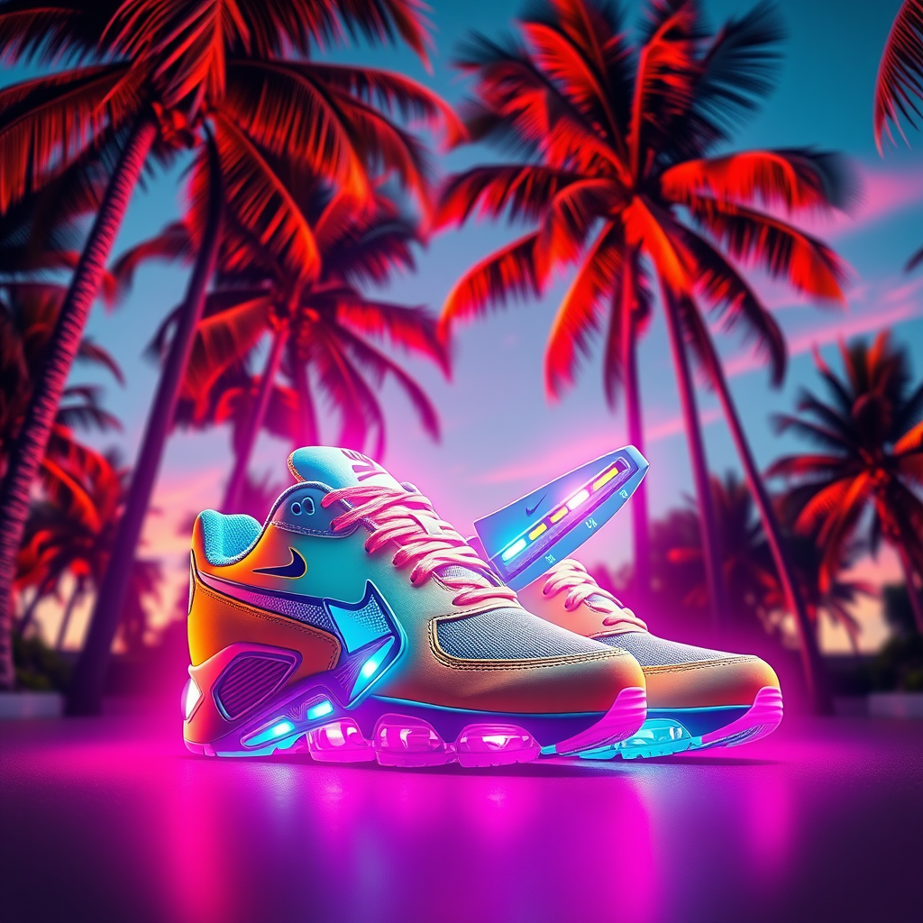 A vibrant pair of sneakers set against a backdrop of swaying palm trees, embodying a fusion of concept art inspired by Dmitry Levitzky and the ethereal essence of Grimes - Book 1 album cover. This creation marries the sleek art deco outrun anime aesthetic with the edgy vibe of Juxtapoz magazine, seamlessly blending into the iconic silhouette of Nike Air Max. Bright neon hues and bold geometric patterns add a dynamic contrast, evoking a sense of futuristic nostalgia and artistic innovation.
