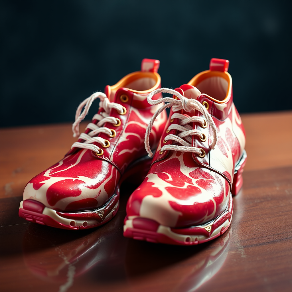 A vibrant pair of surreal shoes crafted entirely from juicy, raw meat, captured in the style of dazzling food photography; the shoes showcase intricate marbling and a sheen of glossy freshness, with twists of swirling fat mimicking laces, creating an avant-garde fashion statement that's both audacious and mouthwatering.