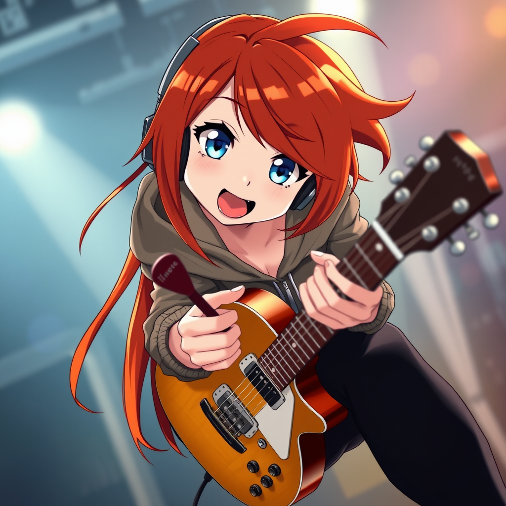 A vibrant photo of an animated redhead girl with long hair swept to one side, playfully flirting with the camera. She has striking blue eyes and a captivating smile, wearing black pants and a cozy hoody. Her bright red lips add an alluring touch to her Asian features. Equipped with headphones, she's energetically holding a plectrum and a guitar, posed at a dynamic angle. The scene is rich with hyper-detail and dramatic lighting, creating intricate shadows and highlights. The blurry background enhances the high contrast and best quality of the image, capturing her in a full-body cowboy shot like a character straight out of a lively anime.