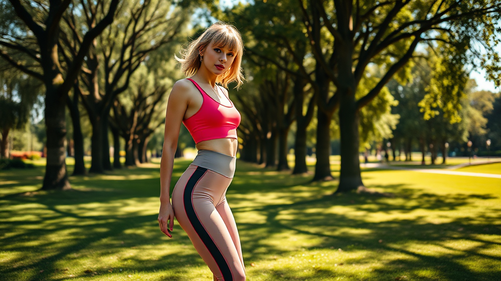 A vibrant photo of Taylor Swift in a stylish workout outfit standing gracefully in a park, captured in ultra-high resolution with a Canon EOS R6. The scene shows realistic shadows cast naturally by the bright sunlight. Photographed using a 135mm lens, the settings are 1/1250s, f/2.8, ISO 400. The serene atmosphere is enhanced by surrounding tall trees and the soft rustle of leaves, with no other people around, allowing for a peaceful, focused moment.