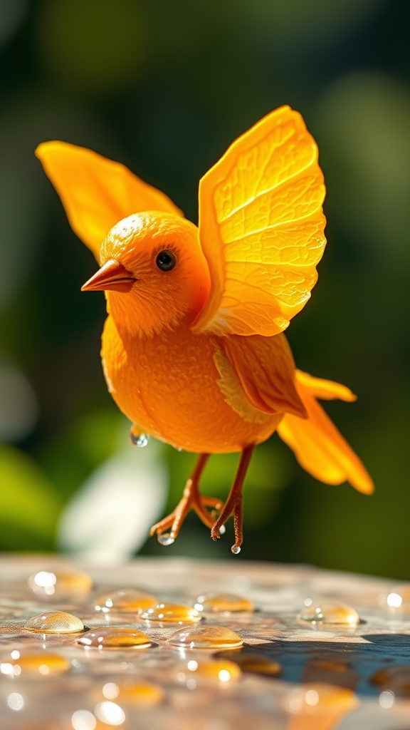 A vibrant, photo-realistic depiction of a tiny bird crafted from a freshly sliced orange, its wings subtly textured with juicy pulp, the orange's skin forming a delicate beak and tail, surrounded by drops of citrus juice glistening in the light, a touch of sunlight casting a soft, warm glow to enhance the vivid colors, set against a soft, blurred natural background to highlight the bird's intricate details, evoking a sense of whimsy and freshness.