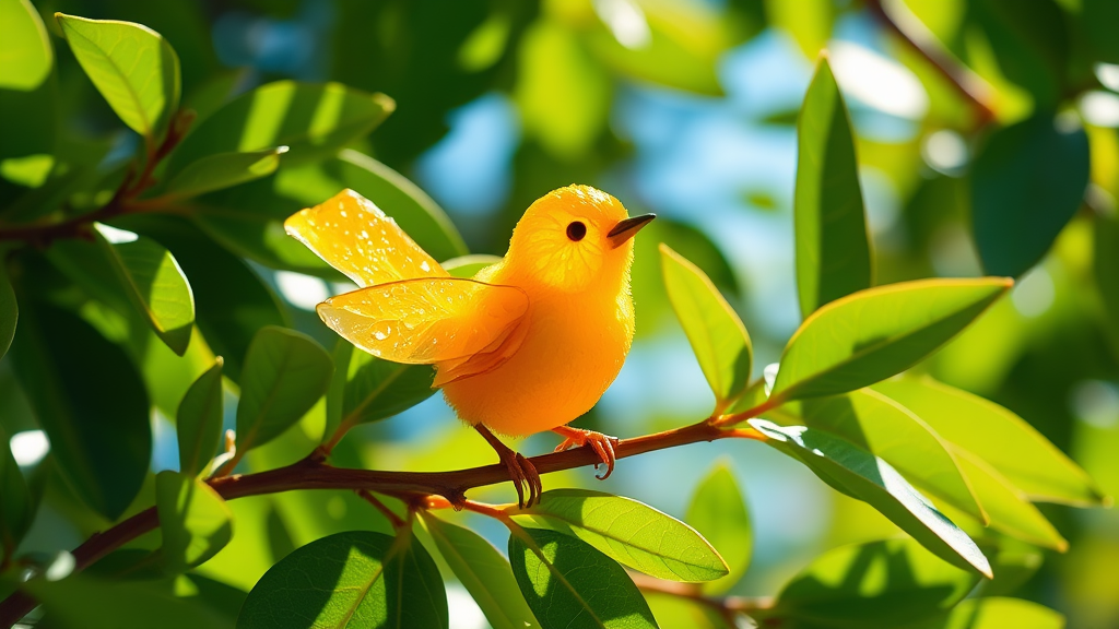 A vibrant, photo-realistic scene featuring a small, delicate bird crafted from a freshly sliced orange, its wings and tail made from thin, translucent segments of the fruit, glistening with tiny droplets of juice. The bird perches on a branch adorned with lush green leaves, casting gentle shadows that add depth. Sunlight filters through the leaves, illuminating the bird's citrusy texture and highlighting the intricate patterns of its orange peel feathers. The setting exudes a fresh, lively atmosphere that draws attention to the bird's unique, edible design while maintaining a whimsical and enchanting quality.