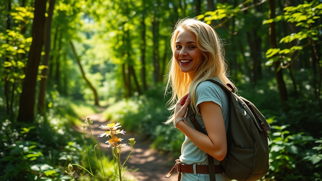 A vibrant photograph captures a blonde Instagram influencer joyfully exploring a lush forest trail on a bright, sunny day. The scene is filled with rich greens and dappled sunlight filtering through the trees, highlighting her casual yet stylish hiking attire. She carries a trendy backpack and pauses to admire a cluster of wildflowers, her expression one of appreciation and serenity. The photo conveys an authentic connection with nature, showcasing the beauty and tranquility of the woods, enhanced by the natural warmth and clarity of the midday sun.